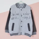 - Neutral grey varsity jacket with uplifting “Being Kind Is Cool” graphic.