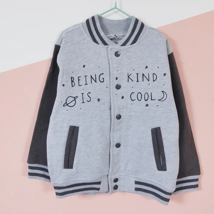 Being Kind Is Cool Kids Grey Varsity Jacket – stylish, durable, positive kidswear. Shop now 50% OFF Free Shipping 2025.