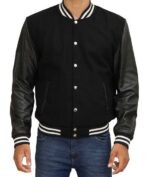 The Black Varsity Jacket With Leather Sleeves is a timeless piece that blends classic varsity style with modern streetwear fashion. Known for its bold contrast and sleek design, this jacket is the perfect mix of tradition and edge. The wool-blend body delivers warmth and comfort, while the genuine or faux leather sleeves add a premium finish that elevates its overall look. Whether you’re going for a casual outfit or making a fashion statement, this jacket brings versatility and lasting appeal.