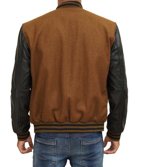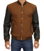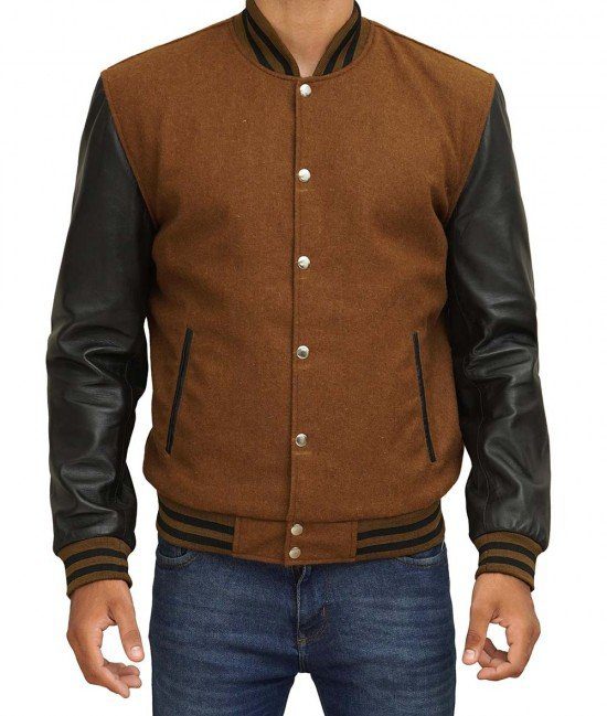 Constructed with a wool-blend body and genuine leather sleeves, the Brown Varsity Jacket With Black Leather Sleeves ensures durability, warmth, and comfort. The rib-knit cuffs, collar, and hemline deliver a snug varsity fit, while the snap-button closure allows for easy layering over hoodies or casual tops. With subtle varsity detailing, this jacket merges traditional letterman aesthetics with modern style, making it a versatile addition to any wardrobe.