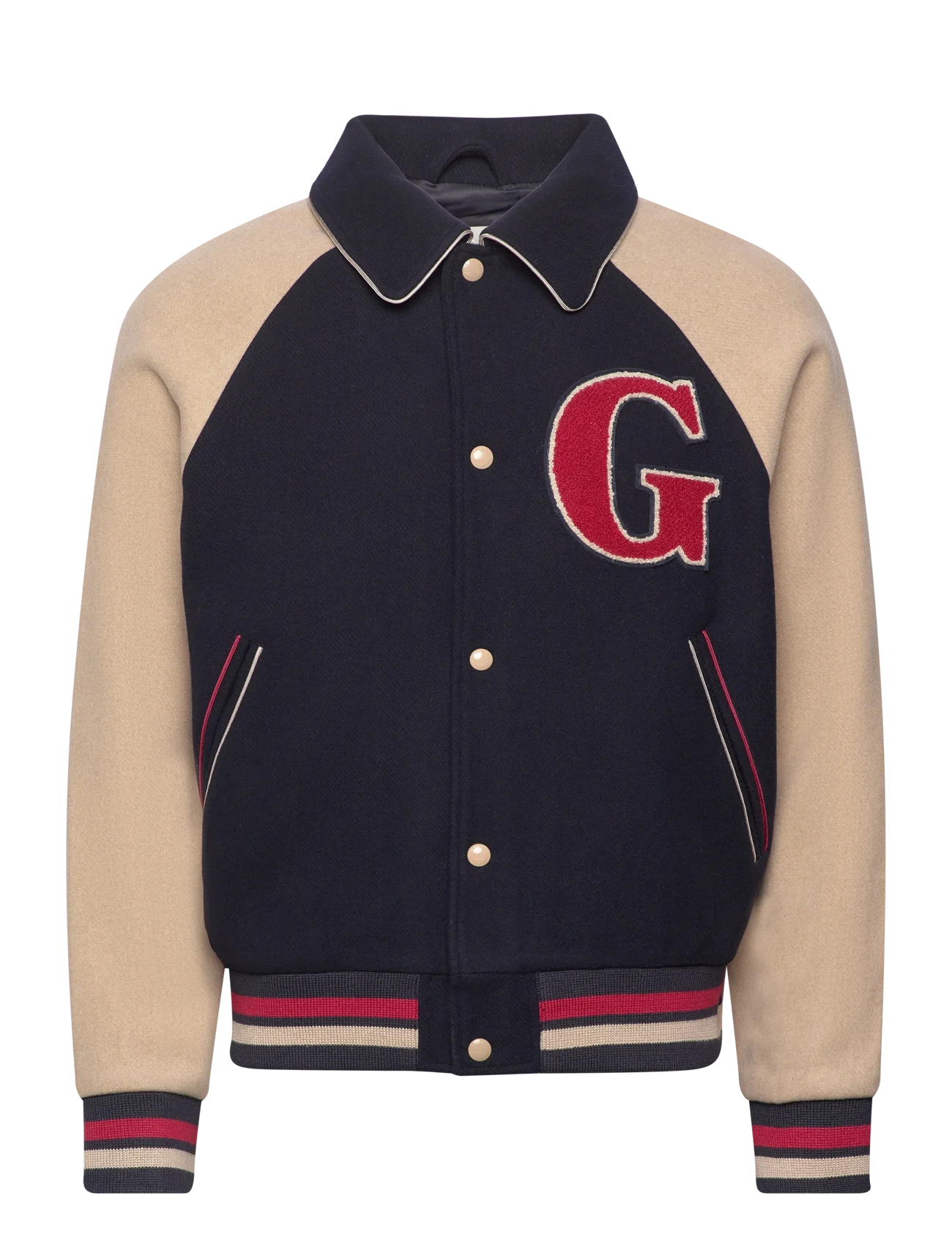 Made from high-quality wool, this varsity jacket ensures warmth, durability, and comfort. The ribbed collar, cuffs, and hem provide a secure fit, while the button-up snap closure enhances its authentic varsity construction. Featuring Gant’s clean and minimalistic detailing, the Evening Blue Wool Varsity Jacket delivers sophistication without sacrificing casual versatility.