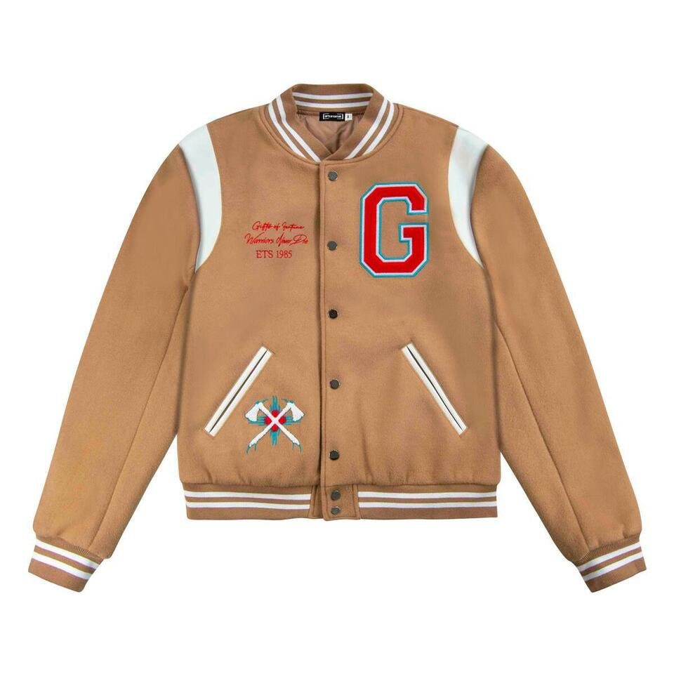 Step into style and confidence with the Gifts Of Fortune Never Die Tan Varsity Jacket. This jacket blends modern streetwear energy with the timeless varsity look. With its bold statement and eye-catching design, it’s perfect for anyone who wants to stand out in everyday fashion.