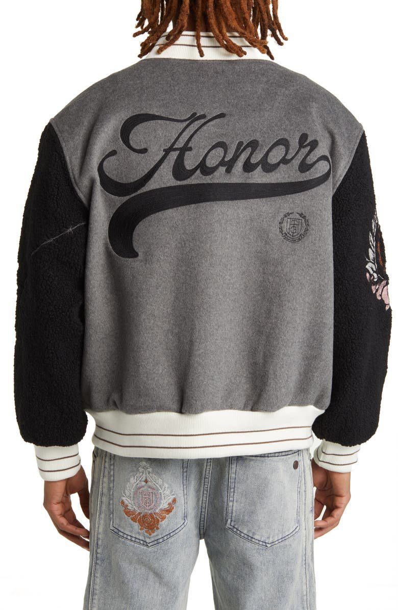 Honor The Gift Faux Shearling Sleeve Grey Varsity Jacket Timeless Streetwear With Luxurious Edge