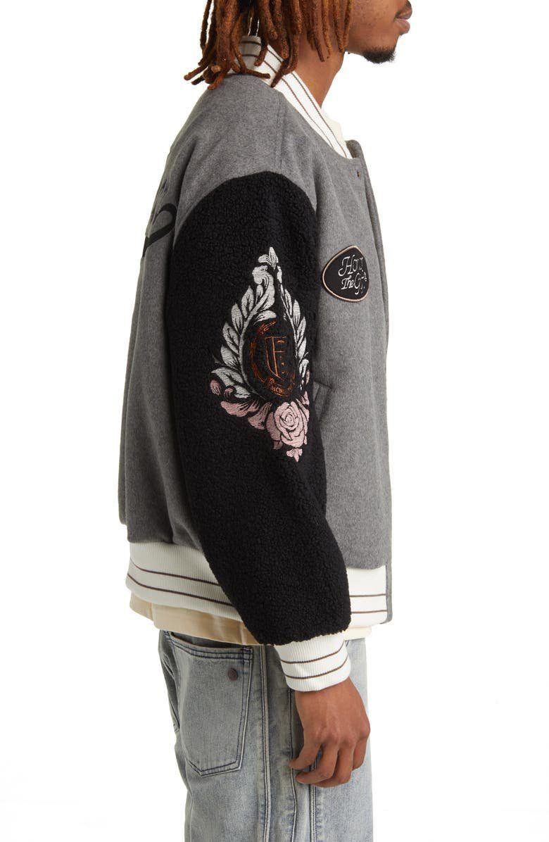 - The Honor The Gift Faux Shearling Sleeve Grey Varsity Jacket blends varsity heritage with luxurious modern design