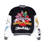 Key Features Of Looney Tunes Thats All Folks Bw Varsity Jacket