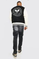 The Man Official Black And White Wool And Leather Varsity Jacket blends timeless varsity tradition with contemporary streetwear style. Featuring a classic black wool body paired with crisp white leather sleeves, this jacket offers a striking contrast that makes it a wardrobe standout. Designed for both comfort and durability, it’s perfect for casual outings, social events, or everyday wear. Its versatile design allows you to effortlessly pair it with jeans, joggers, or sneakers, creating a stylish look for any occasion. The premium construction ensures warmth and long-lasting quality, while the classic varsity silhouette adds a sporty yet sophisticated edge to your streetwear collection.