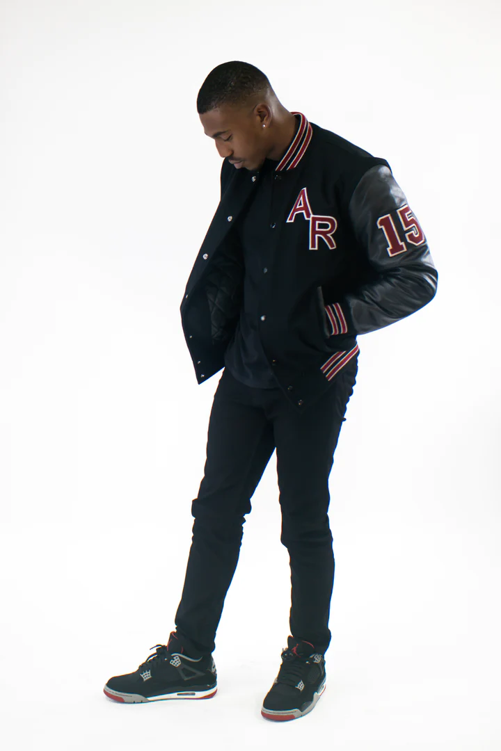- Classic varsity silhouette with modern embroidered detailing