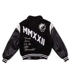 Crafted with attention to detail, the MMXXII Black Wool And Leather Varsity Jacket features a wool body with genuine leather sleeves, reinforced stitching, and a tailored fit. Its quilted lining ensures warmth and comfort, making it ideal for fashion enthusiasts, collectors, or anyone who wants to stand out.