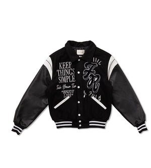 - Snap-button front closure for classic varsity style