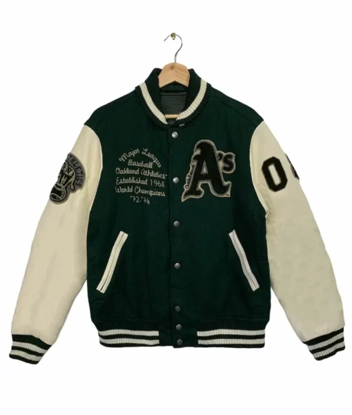 Crafted from high-quality wool with leather or fabric sleeves, the Oakland Athletics Varsity Jacket delivers warmth, comfort, and durability. Its varsity-inspired construction and authentic detailing make it ideal for fans who want to showcase their Athletics pride in style both on and off the field.