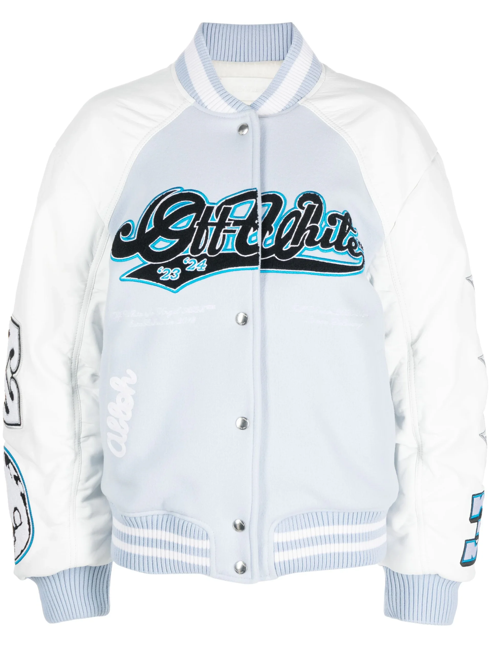 Designed for both style and practicality, the jacket includes premium leather sleeves, ribbed collar, cuffs, and hem, ensuring a perfect fit and long-lasting wear. Ideal for casual outings, urban adventures, or fashion-forward events, the Off-White Moon Wheel Leather Varsity Jacket makes a statement while reflecting your unique style.