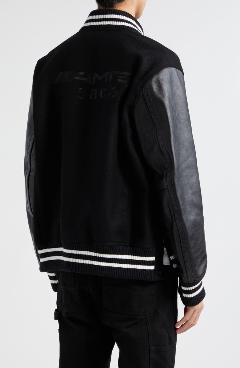 Features Sacai AMG Logo Embroidered Wool & Leather Varsity Jacket