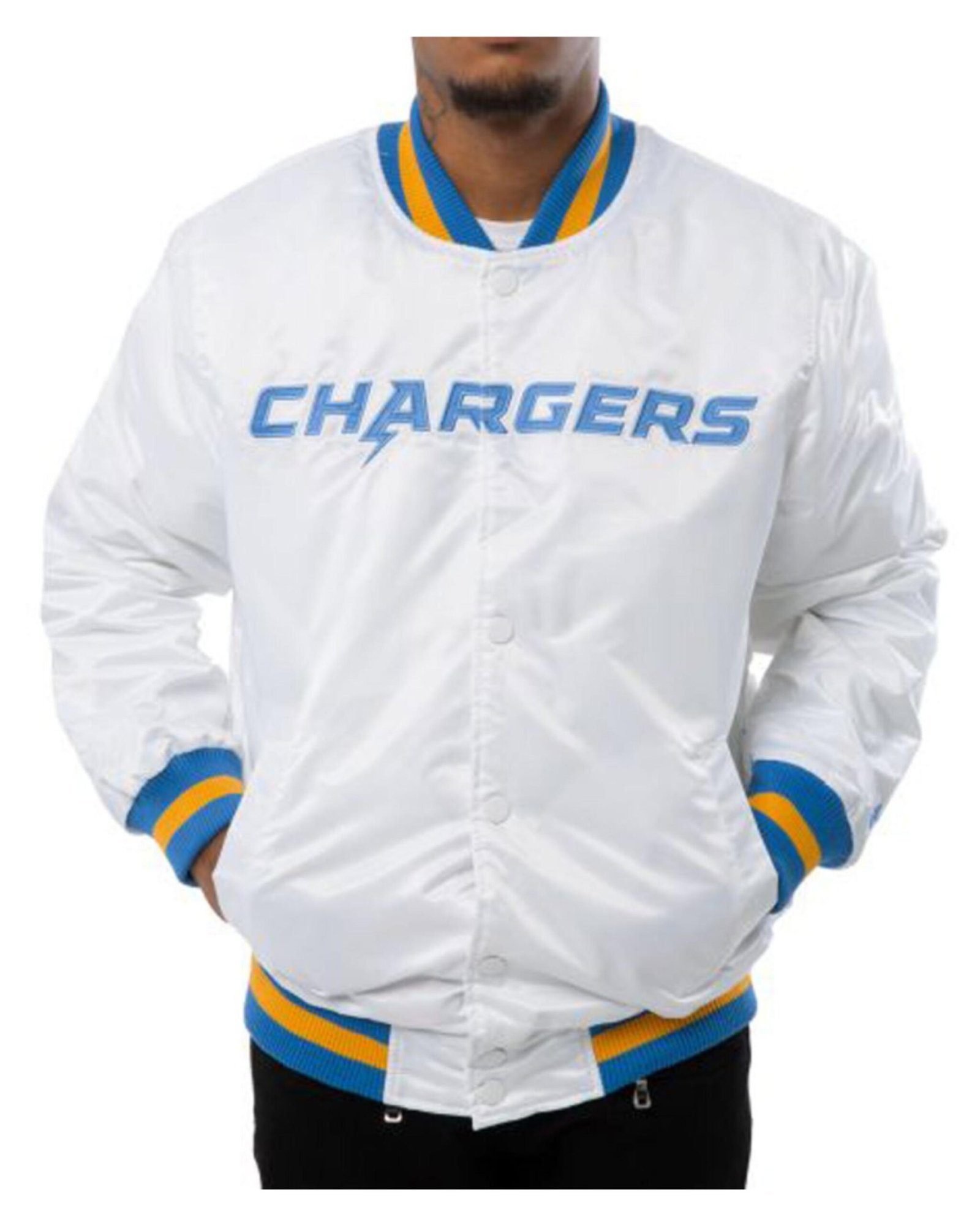 Sleek White Design: Unique all-white bomber with Chargers graphics for a modern, standout look.