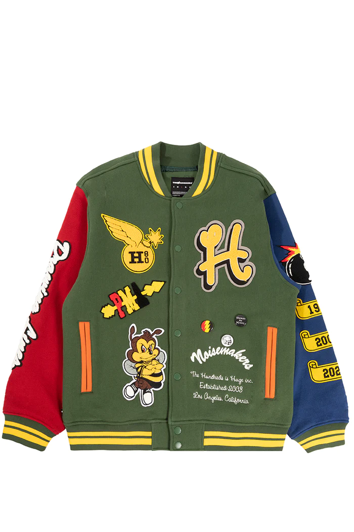 Crafted with a forest green wool body and contrasting details, this jacket offers an instantly recognizable look. The Hundreds branding and graphic accents add a unique touch, giving it that signature streetwear authenticity. Whether you’re layering it over casual wear or adding it as the final piece to your outfit, this letterman jacket guarantees standout appeal wherever you go.