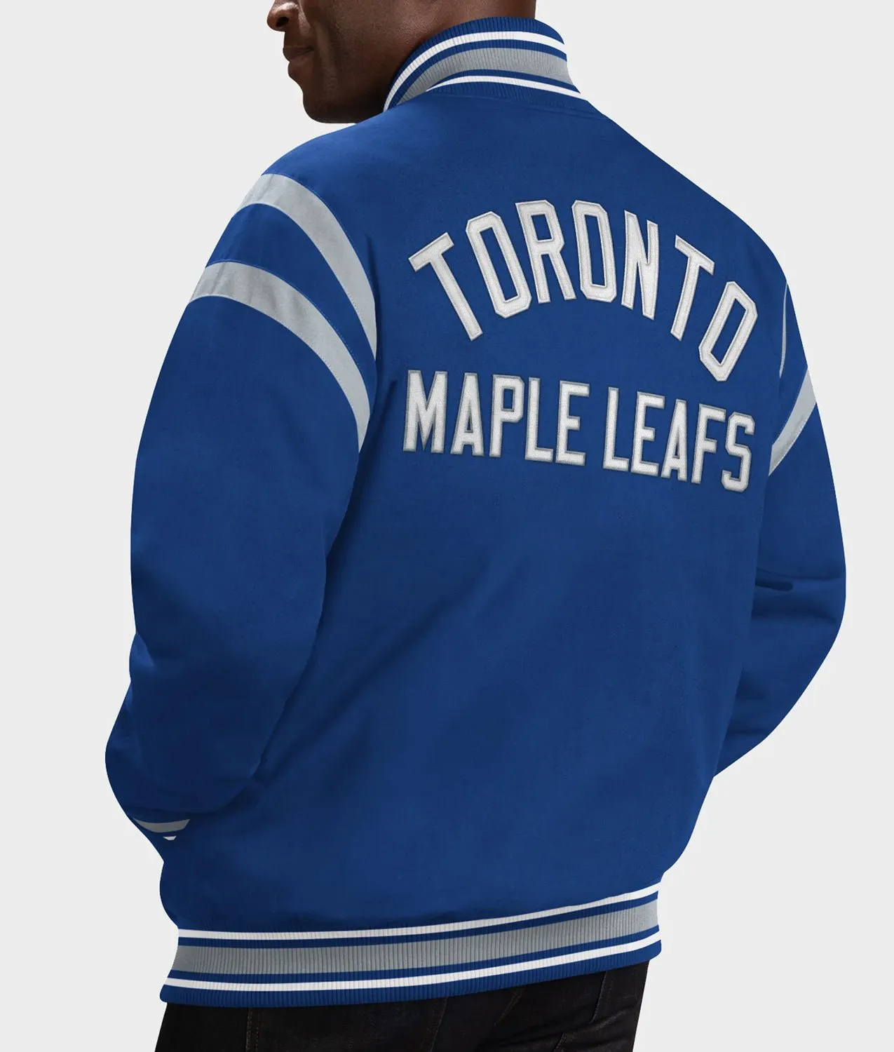 The design stays true to the traditional varsity silhouette, featuring a deep blue wool-blend body paired with crisp white faux leather sleeves. The front showcases embroidered team logos, while the back highlights bold Toronto Maple Leafs graphics that represent your team spirit with authenticity. Snap-button closure, rib-knit cuffs, collar, and hem enhance the retro varsity vibe, making it an eye-catching addition to your wardrobe.