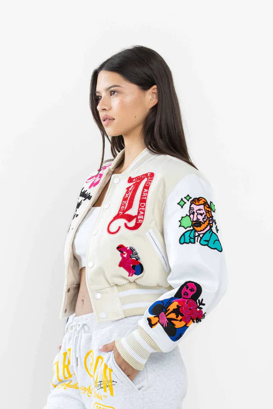 Womens First Row Art Dealer Graphic Cropped Cream Varsity Jacket