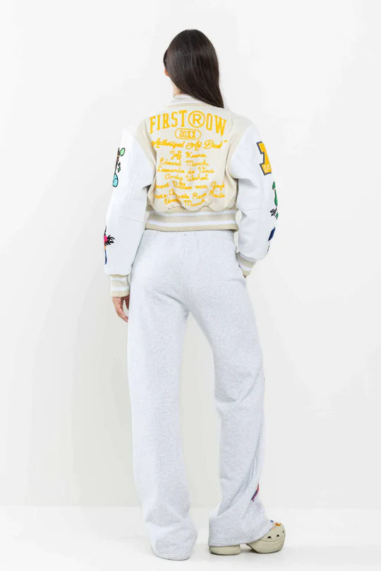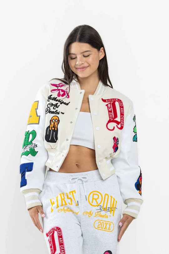 Its cropped fit and modern design make it easy to pair with high-waisted jeans, skirts, or joggers, creating endless outfit options. The lightweight yet durable construction ensures all-day comfort, while the First Row Art Dealer graphics make a bold fashion statement. If you’re searching for a varsity jacket that goes beyond the basics, this one is made for you.
