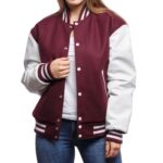The Womens Maroon And White Wool And Leather Varsity Jacket is a stylish and versatile wardrobe essential. Its bold maroon-and-white colors, premium materials, and classic varsity design make it perfect for showcasing style and comfort. Order today and enjoy our exclusive 50% OFF offer to add this standout jacket to your collection.