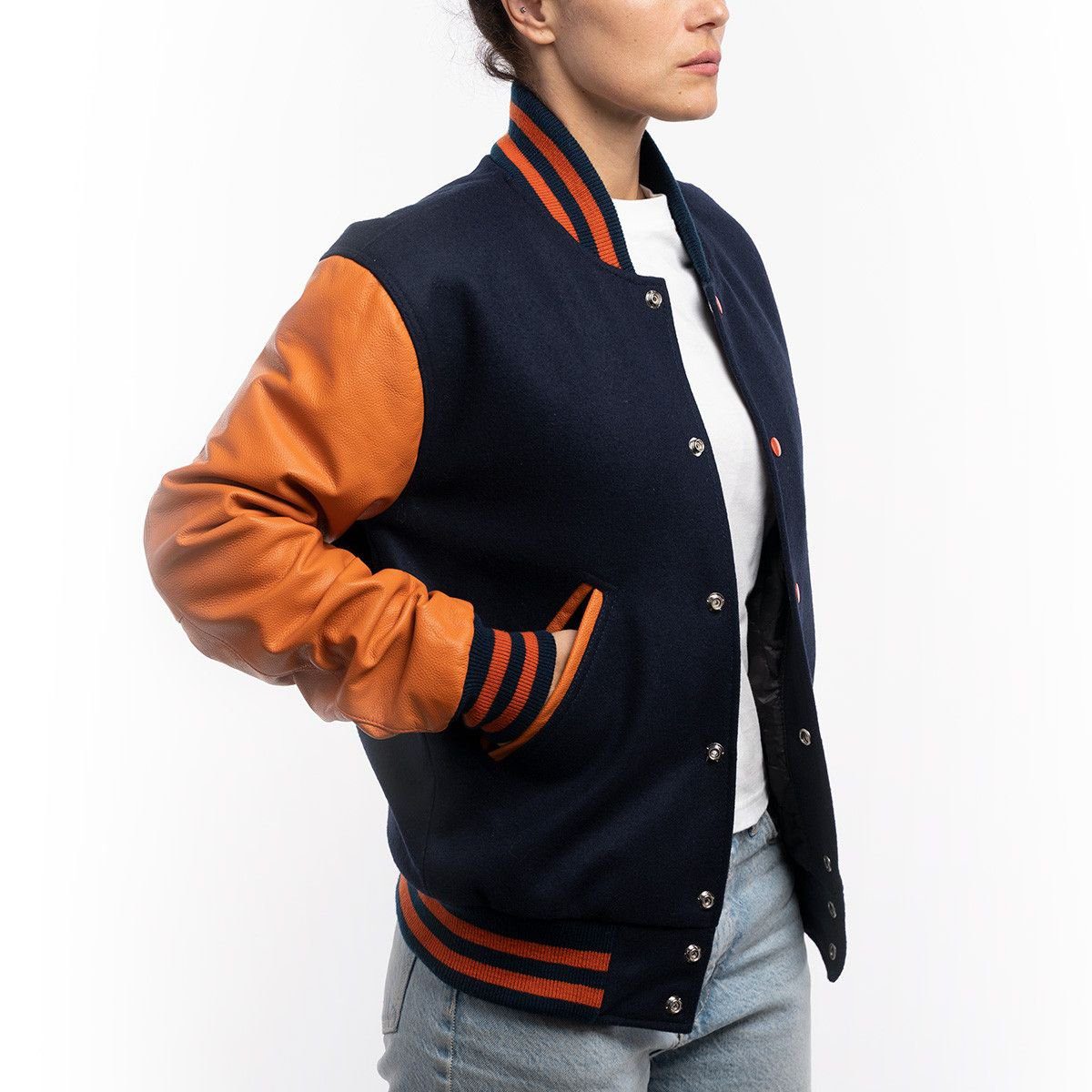 Womens Navy Blue And Orange Wool And Leather Varsity Jacket with premium materials, classic varsity design, and bold colors. Shop now at 50% OFF.