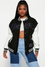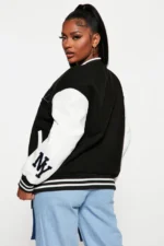 The Womens New York Black And White Varsity Jacket blends timeless varsity style with modern fashion. Featuring a sleek black body with crisp white sleeves, this jacket provides a polished and versatile look ideal for casual outings, school events, or game days. Crafted with premium materials, it ensures durability, comfort, and the perfect combination of sporty and chic style.
